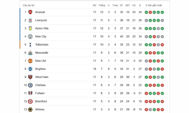 Dưới đây là top 10 CLB đứng đầu Bảng xếp hạng Ngoại Hạng Anh 2023/24 cập nhật T12/2023